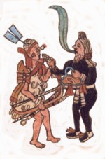 | .AXAYACATL: āxayacatl: *~ n.pers., souverain de Tenochtitlan (1469-1481). Fils de Huēhueh Tezozomoctli, il est le frère cadet de Tizoc et de Ahuitzotl. Cron. Mexicayotl 114. Petit fils de Moctezuma Ier et petit fils d'Itzcoatl, il fut élu à la mort de Moctezuma Ilhuicamina en 1469 (W.Lehmann 1938,264) grâce au soutient du Cihuacoatl Tlacaellel. Cf. aussi Chim3,136 - 100r. (année 1469 - 3 calli). En 1473, sous prétexte que le seigneur de Tlatelolco, Moquihuix, qui a épousé une sœur d'Axayacatl néglige son épouse pour ses concubines, en réalité pour s'emparer de la puissance commerciale développée par Tlatelolco, la ville est mise à sac et Moquihuix est tué ou contraint au suicide. Des conquêtes militaires suivront dans la région occidentale. Les Matlatzinca de la vallée de Toluca sont vaincus. Tollohcan est attaquée en 1477, Ocuillan et Malinalco une année plus tard. Et une révolte de Cuauhnahuac est écrasée. En 1477 il aé fallu faire face à une révolte de Tollohcan. Mais l'extension des territoires controlés par les Mexica les met en contact avec les Tarasques. D'où des conflits frontaliers qui deviendront de plus en plus sanglants jusqu'en 1480. La tentative d'invasion du Michoacan se soldera par la déroute des Mexica battus par les Tarasques qui emploient des armes de cuivre. Jamais les Mexica ne pourront vaincre le royaume tarasque et sa capitale Tzintzuntzan. Des forteresses défensives marqueront la frontière entre les deux rivaux. Pourtant les conquêtes continuent dans d'autres directions. Dans l'actuel Etat de Puebla on occupera des territoires autrefois tenus par Texcoco. Vers le Nord Est on progressera dans le territoire huastèque en atteignant vers 1480 - 1481 Tampatel Tuxpan et Tenexticpac. |